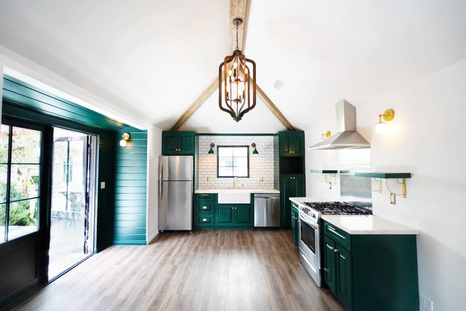 Classic Hollywood accents like green cabinets, brass hardware and a Hollywood Regency chandelier bring a retro glamour to this updated kitchen.
